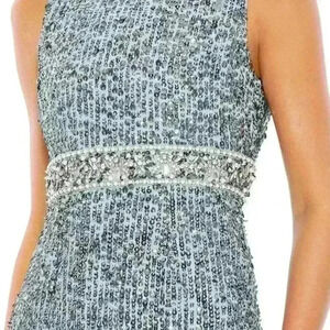 Upstage everyone with the sheer elegance of this Mac Duggal 10839 creation. Streaming with shimmering sequins on its fitted length, this gown flaunts a jewel neckline with bejeweled accents. Wrapped with gems along the waist, the skirt flows into a floor length hemline. Leave a trail of admirers in this Mac Duggal masterpiece.