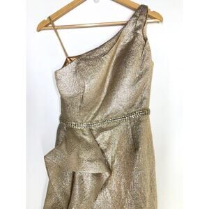 Mac Duggal Dress One Shoulder Metallic Ruffled Evening Gown Oyster Size 0 NWOT