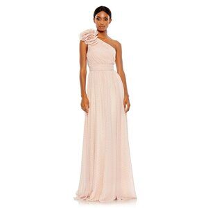 Step into elegance with this stunning Mac Duggal ruffled one-shoulder gown. Designed in blush rose with shimmering golden polka dots, this dress is perfect for formal events, weddings, proms, and galas.