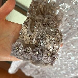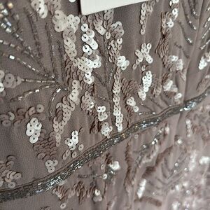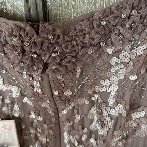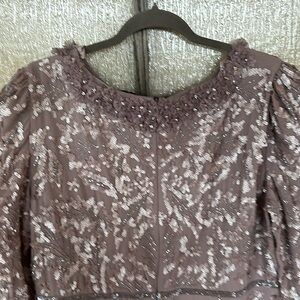 Fully lined through bodice and skirt; semi-sheer unlined sleeves