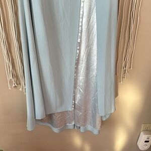 Full-length sleeveless gown with a sheer bodice, thigh-high slit, ruffled peplum waist, and a sweeping train. The natural waist is defined by a hand beaded belt.