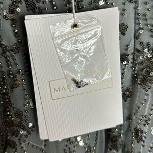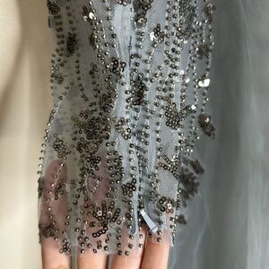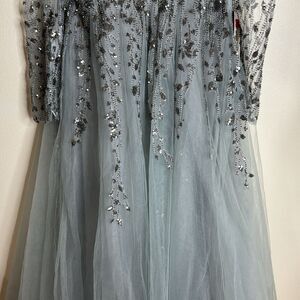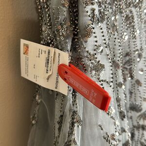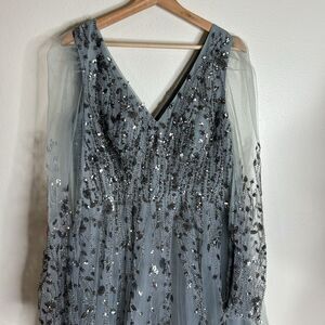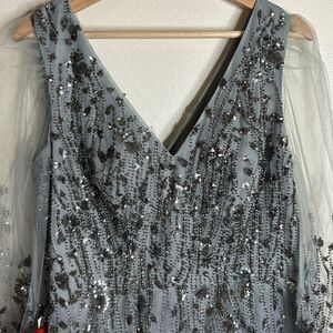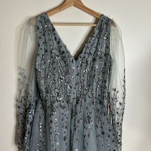 Mac Duggal EMBELLISHED V NECK LONG SLEEVE A LINE GOWN in platinum blue size 12