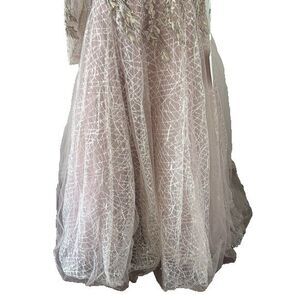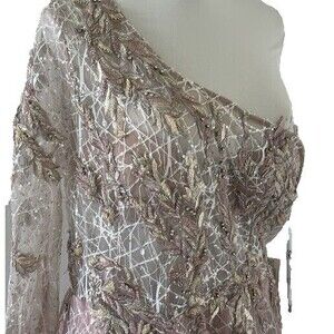 * Hand beaded leaf appliqué featured along sleeve and illusion bodice