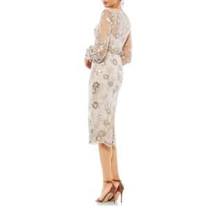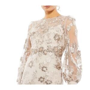 New with tags Mac Duggal Embellished High Neck Illusion Long Sleeve Midi dress gown in Mocha, which is a beige, tan, gold. Hand-embellished embroidered overly, polyester lining. Partially lined bodice, fully lined skirt, sheer unlined sheeves. Illusion high neckline. Long bishop sleeves. Floral embroidery accented by hand-stitched sequins. Back vent slit. Concealed back zipper. In new condition.