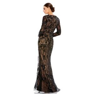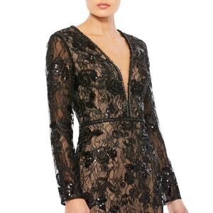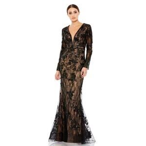 Mac Duggal Embellished Long Sleeve Plunge Neck Trumpet Gown Black Nude SZ 12 NWT