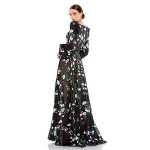 Mac Duggal Embroidered Bishop Sleeve V Neck Flowy Gown Black Multi NWT 14