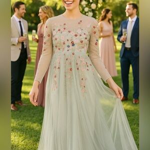 Embroidered Illusion High Neck Long Sleeve A Line Gown