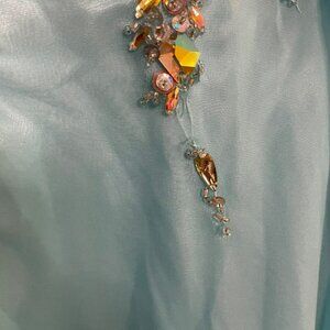 There is only one place on the back that I could tell might be missing a few beads/stones, as shown in photo. Some light wear on inside of neckline from makeup. Bottom hem has very light dust/dirt as shown in photos. Gorgeous dress!!
