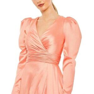 Mac Duggal Faux Wrap Puff Shoulder Long Sleeve A-Line Gown Peach