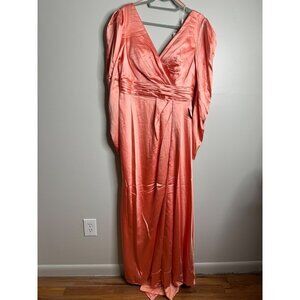 Floor-length satin gown with puff-shoulder long sleeves, faux-wrap bodice, v-neckline, pleated waistband, and a thigh-high slit.
