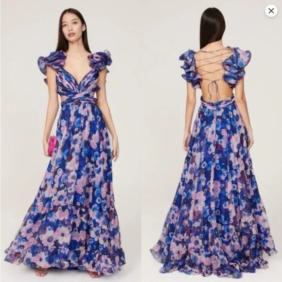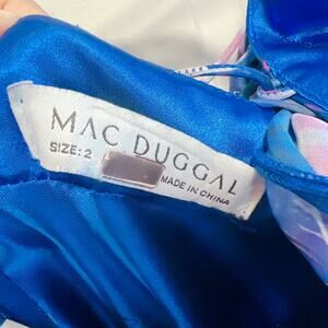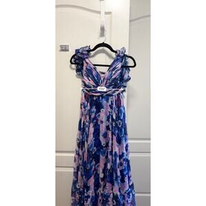 Blue floral chiffon (100% Polyester). Ball. Sleeveless. Plunge neck. Back zipper closure.