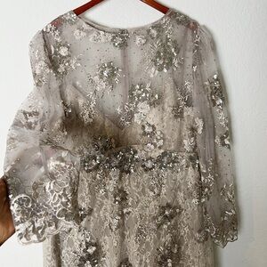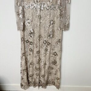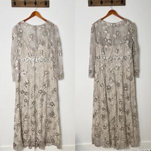 This long sleeve, floor-length gown features a v-neckline beneath a mesh illusion overlay across the yoke and sheer illusion sleeves. Gown is embellished with allover floral embroidery and delicate floral sequin detailing.