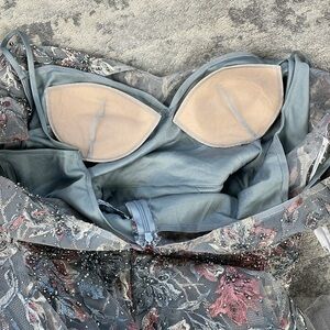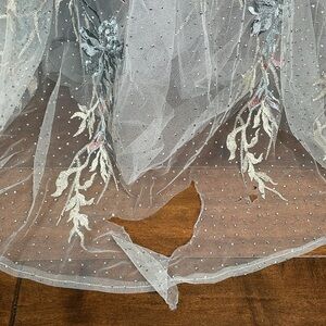 This has the tag attached but appears to have been worn. And it has a large and small tear on the outer layer of the back train. Could fix but just shortening the dress and not having a train.
