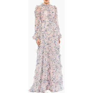 Mac Duggal Floral Gown High Neck Long Sleeve Flowy Ruffle Formal Maxi Dress Sz 8