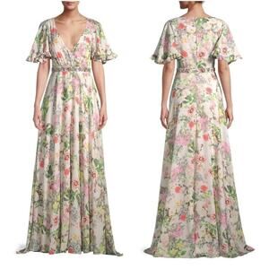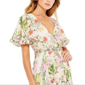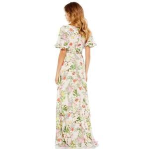 Mac Duggal Floral Print Faux Wrap Flutter Sleeve A-Line Gown Multicolor 4 NWT