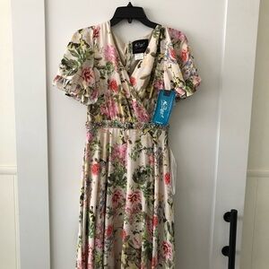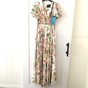 Floral surplice maxi dress with a faux-wrap v-neckline, ruffle-trimmed short bell sleeves, and a pleated full-length skirt. The waist is accented with a floral rhinestone-embellished belt.