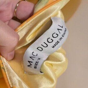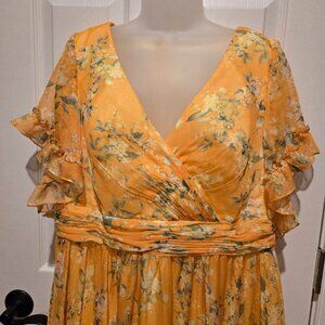 Mac Duggal Flounce Sleeve Floral Maxi Dress in Yellow Multi Size 14 - excellent preowned condition. Gorgeous floral maxi dress, size 14 women's plus sized. Perfect for spring and summer, formal events, etc. Whimsical floral maxi dress, ruched bodice, faux-wrap V-neckline, sheer flutter short sleeves, pleated waistband, and a tiered flowy skirt for a romantic touch.