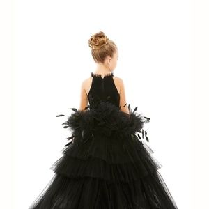 Mac Duggal GIRLS HIGH NECK TULLE DRESS WITH FEATHER DETAIL