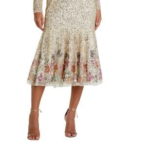 Mac Duggal Gold Multicolor Faux Wrap Long Sleeve Tea Length Dress Women’s Sz 12