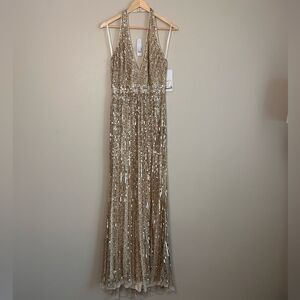 Mac Duggal Gold Nude Beaded Sequin Halter Evening Gown Style 5759