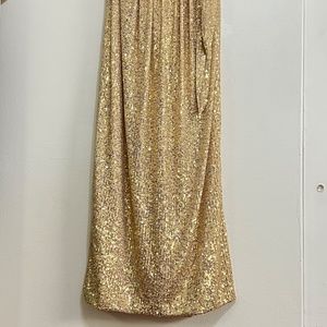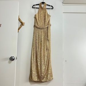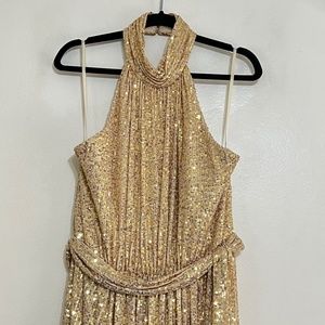 Mac Duggal Gold Sequin Halter Neck Sheath Gown Dress, size 16