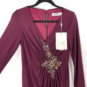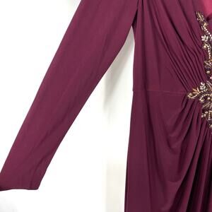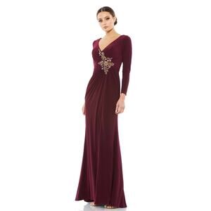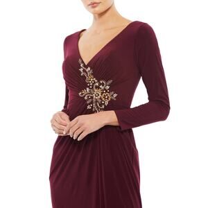 Mac Duggal Gown Burgundy V-Neck Long Sleeve Crystal Floral Embellished Sz 4