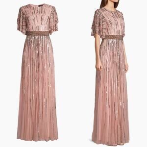 Stunning full-length gown with allover sequin and beaded stripe embellishment. Gown features a round neckline, layered short sleeves, and a dramatic bejeweled belt at the waist.