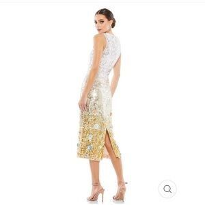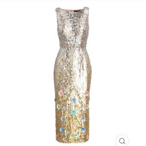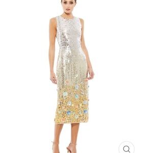 This chic, fully sequined midi dress has a metallic silver bodice that gradually transitions to a metallic gold mid-thigh. The straight, midi-length skirt is embellished with stunning hand-beading and 3D floral accents.
