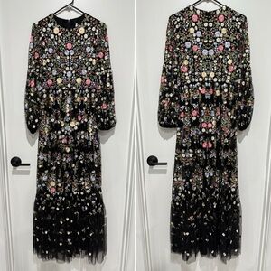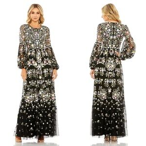 Mac Duggal High Neck Floral Embroidered Long Puff Sleeve Dress in size 4. New with tags. This popular gown features a high neckline and elegant puff sleeves adorned with floral embroidery, exuding a captivating appeal. Flaunt your beauty in this enchanting ensemble and leave a lasting impression with every step. Sheer Floral-embroidered Overlay Fabric. 100% polyester lining. Partially lined bodice, fully lined skirt, sheer unlined sleeves. High neckline. Illusion long sleeve. Hand-stitched floral application featured throughout body. Concealed back zipper. Approx. 62.5" from top of shoulder to bottom hem.