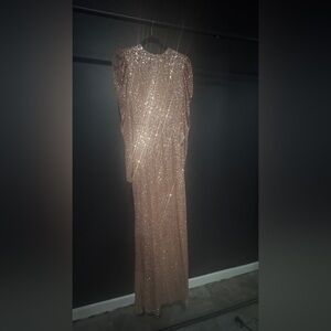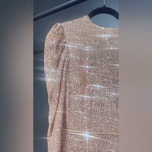 Crafted from sequin fabric, this gown exudes elegance and sophistication. Long puff sleeves add drama to the column silhouette, making it perfect for formal occasions.