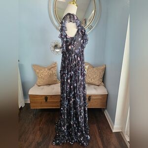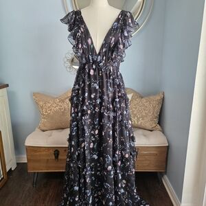 The Mac Duggal gown is a stunning piece designed for special occasions like weddings and proms. This sleeveless dress features a dramatic plunge neckline adorned with ruffles, adding a touch of elegance. The tiered design in black and pink creates a captivating silhouette, perfect for making a statement. With its flutter sleeves and flowing style, this gown embodies sophistication and grace.