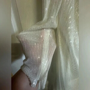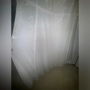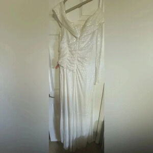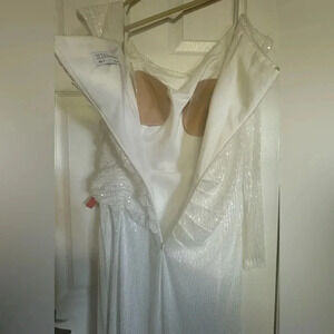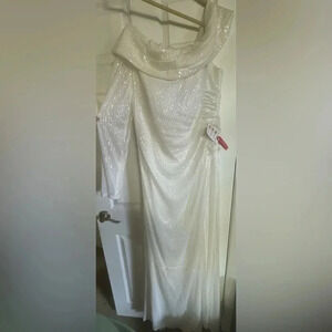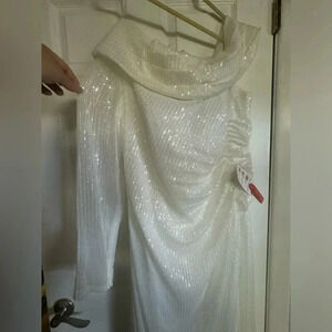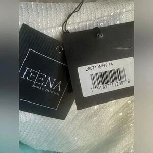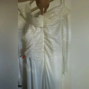NWT Ieena for Mac Duggal white one right zippered long sleeve with shoulder on left side. The sequins are a white see through color on top. Small train and slit gathered left hip. Stunning for a wedding dress or formal event. No bead packet.