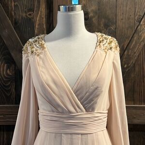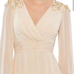 Stunning ivory gown by Mac Duggal. Features embellished shoulders and V-neckline. Long sleeves with a high slit for elegance.