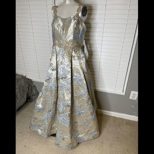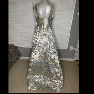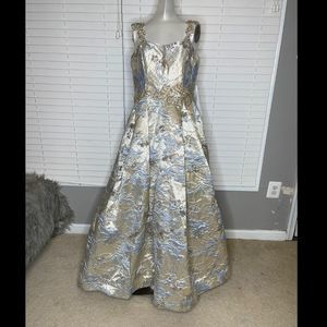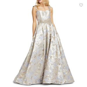 Breathtaking satin ball gown showcases a design of jacquard floral and gleaming embellishments throughout.