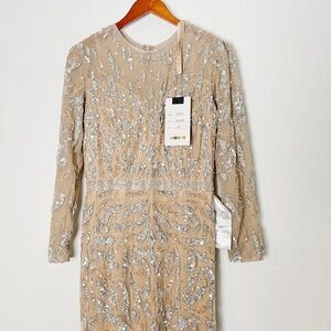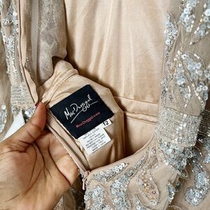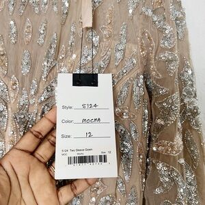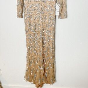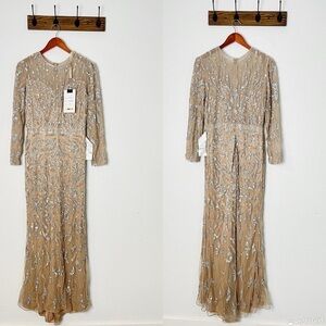 The whole ensemble is designed in sequin embellishments as the fitted bodice features a plunging V neckline and slender long sleeves, complemented with a full back secured with a center zipper closure. The skirt parades a sheath silhouette which falls to a full length hemline, finished with a sweep train.
