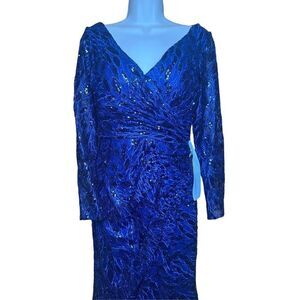 Mac Duggal LONG SLEEVE RUCHED SEQUINED V-NECK GOWN in Midnight Blue NWOT Size 6