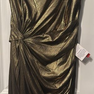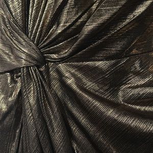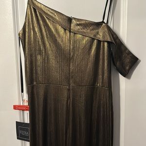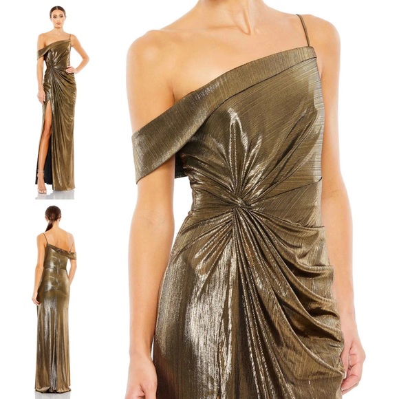 Ieena for Mac Duggal Metallic jersey fabric (100% polyester) Fully lined through body Asymmetric neckline Sleeveless Drop shoulder Twist waist detail Thigh-high front slit Concealed back zipper Approx. 62.5" from top of shoulder to bottom hem Available in Gold Dress has been hemmed. I’m 5 foot and wore 4” heels with the gown.