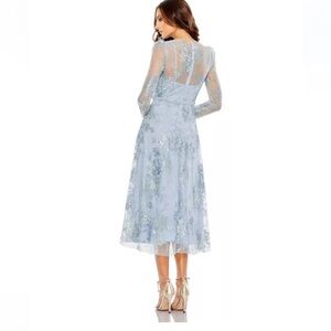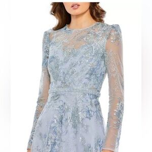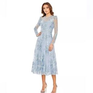 Elegant light blue maxi dress. Features floral lace design. Long sleeves and fitted waist. Perfect for special occasions.