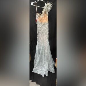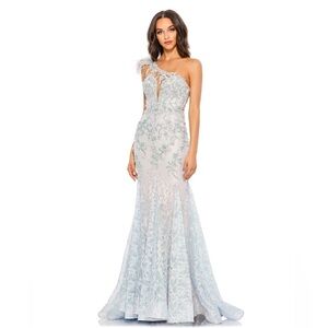 Elegant one-shoulder gown with intricate lace detailing. Features a fitted bodice and flowing skirt. Perfect for formal occasions. This is a beautiful dress on. I wore this to my daughter’s wedding 8/30/25. It has been professionally cleaned and has no damage . No alterations done to dress
