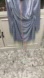 Elegant light blue satin dress. Features a draped design. Long sleeves with a high neckline.