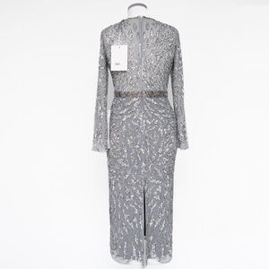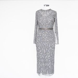 This beautifully detailed Mac Duggal cocktail dress features a jewel neckline, sheer long sleeves, and a tailored silhouette that falls just below the knee. Intricate beading and sequined embroidery shimmer softly over the slate-gray mesh, while a slim beaded waistband defines the waist. Fully lined with a back slit for comfort, it’s an elegant choice for weddings, cocktail parties, or evening events.