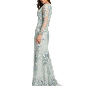 Mac Duggal Long Sleeve Floral Lace Dress in Light Blue and White