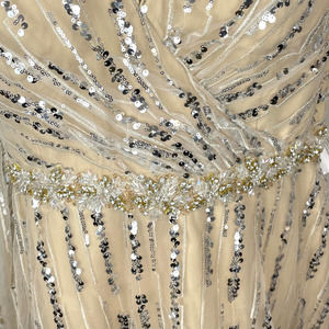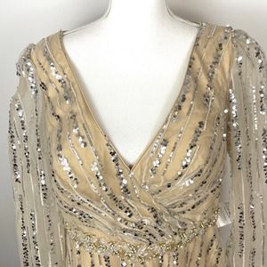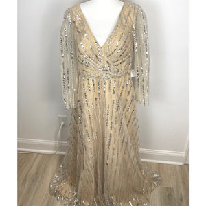 Mac Duggal Champagne Long Sleeve Gown With Silver Sequins 67859 Size 14 New