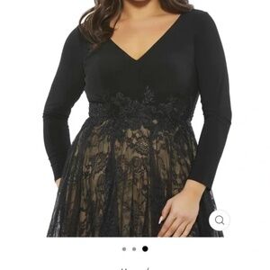 Mac Duggal Fabulouss 67897 black nude plus size formal dress features a jersey bodice over a gathered lace skirt, with a V-neckline and long sleeves. Beaded floral appliques embellish the waist of this tea-length A-line dress.
