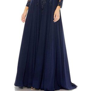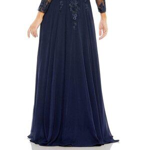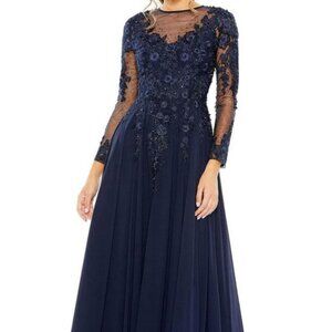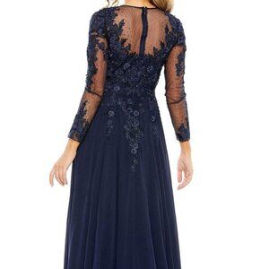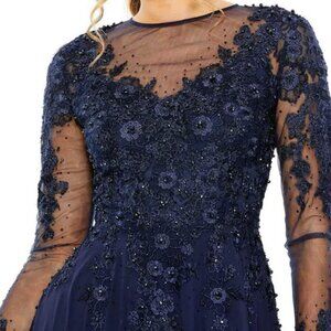 Mac Duggal Midnight Blue Mesh Long Sleeve Embellished A Line Gown