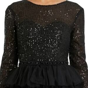 Chic tea-length dress with a sequined bodice, long sleeves, and a round neckline. A-line skirt features black layered tulle, and hand-beaded belt accents the natural waist.