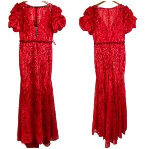 Mac Duggal NWOT Embellished Puff Sleeve Plunge Neck Trumpet Gown Size 10 Red