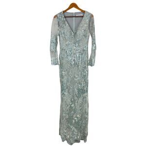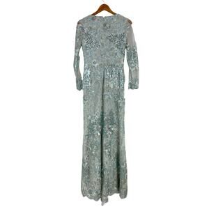 Mac Duggal NWT Embellished V-Neck Illusion Long Sleeve Gown Seamist Size 6 Blue