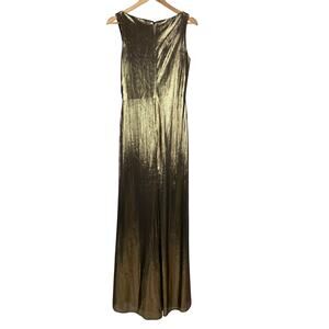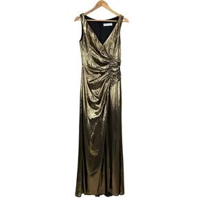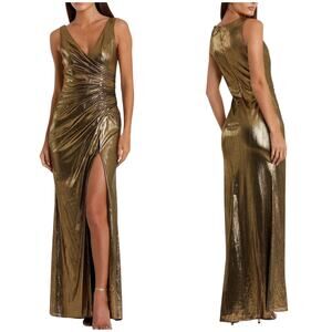 Mac Duggal NWT Gold Metallic Ruched Front Slip V-Neck Gown Size S Side Slit