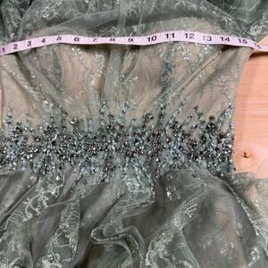 One of a kind stunning lace gown with hand beaded embellishments at the waist and neck. The full length skirt has cascading ruffles throughout.